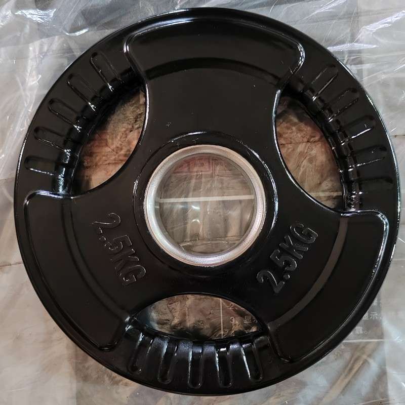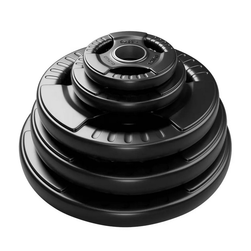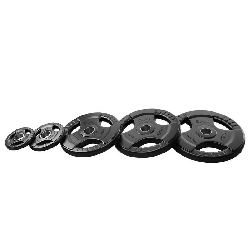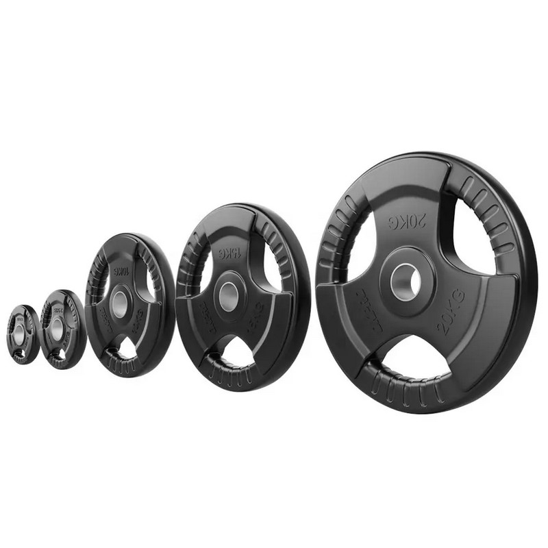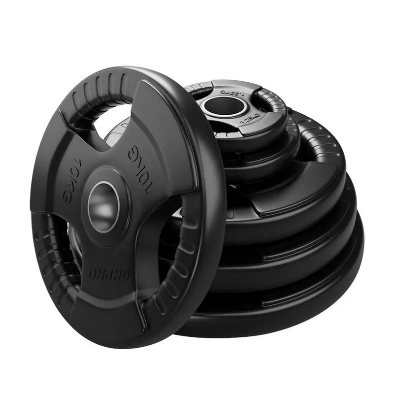 Диск обрезиненный тренировочный с тройным хватом OKPRO OK2005 - съемный снаряд, служащий для весовой регулировки штанги, гантельного грифа, силовых тренажёров. Диск оснащен стальным посадочным кольцом диаметром 51 мм, которое облегчает надевание на гриф и продлевает срок эксплуатации отверстия. Три большие прорези с выемками для пальцев и небольшие выпуклые площадки облегчают подъем снаряда с пола, со стойки или снятие со штанги.