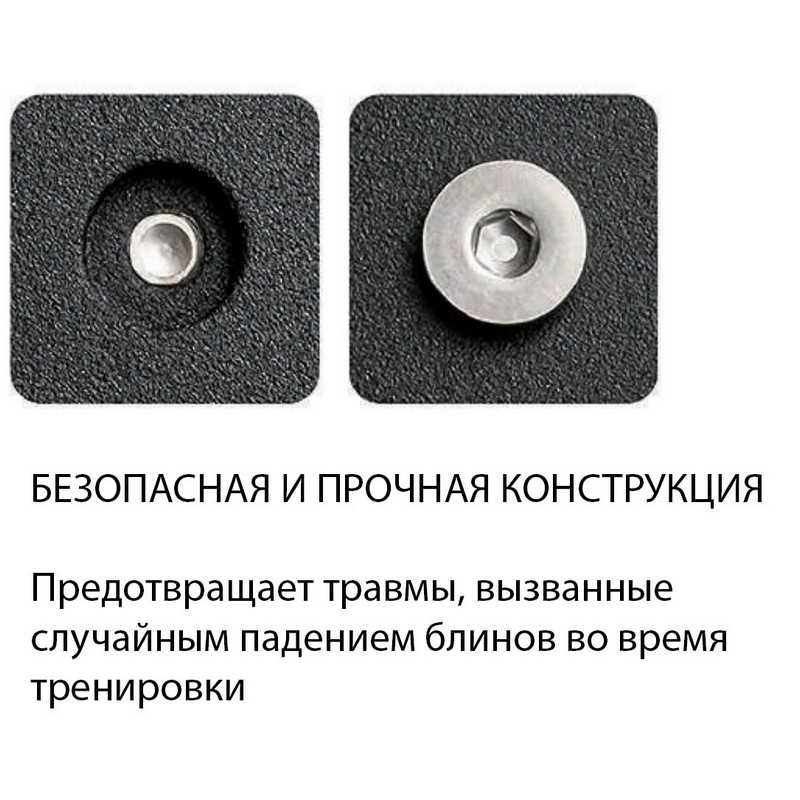 Конструкция снаряда имеет надежную защиту от случайного смещения и падения блинов во время тренировки. Это достигается за счет двух отверстий и двух стальных втулок на каждом диске, благодаря которым каждый последующий блин вставляется в предыдущий. Первые диски приварены к грифу, именно они предотвращает проворачивание всех блинов (начальный вес рукоятки 4 кг).