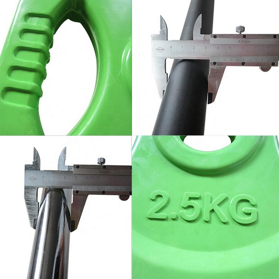 Каждый диск имеет свой яркий цвет - зеленые по 1,25 кг, оранжевые по 2,5 кг и желтые по 5 кг. Диски имеют шестигранную форму, что предотвращает откат штанги и позволяет комфортно ставить штангу после выполнения упражнений.
