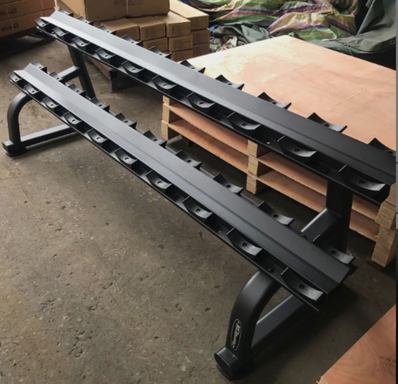 Двухуровневая горизонтальная стойка MD Buddy MD6207B предназначена для хранения 10 пар гантелей от 2 до 60 кг. Походит для круглых и гексагональных весов. Полки с небольшим углом наклона предотвращают скручивание кисти и обеспечивают легкое снятие и постановку гантелей на полки. Ложементы из прочного ABS-пластика защищают поверхность рамы и грифа гантели, амортизируют удар, снижают шум при резком опускании гантелей. Горизонтальный дизайн позволяет быстро найти нужный вес и начать тренировку.