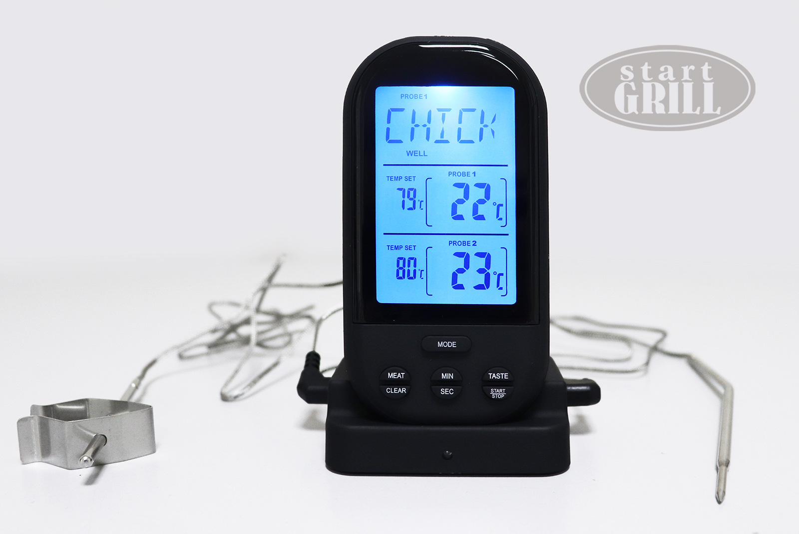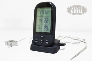 Беспроводной цифровой термометр является необходимым и незаменимым инструментом при приготовлении блюд на гриле. Отличительной особенностью данного прибора - наличие двух температурных щупов. Один применяется для контроля температуры внутри блюда, второй для контроля температуры внутри гриля. Цифровой термометр прост и удобен в применении.