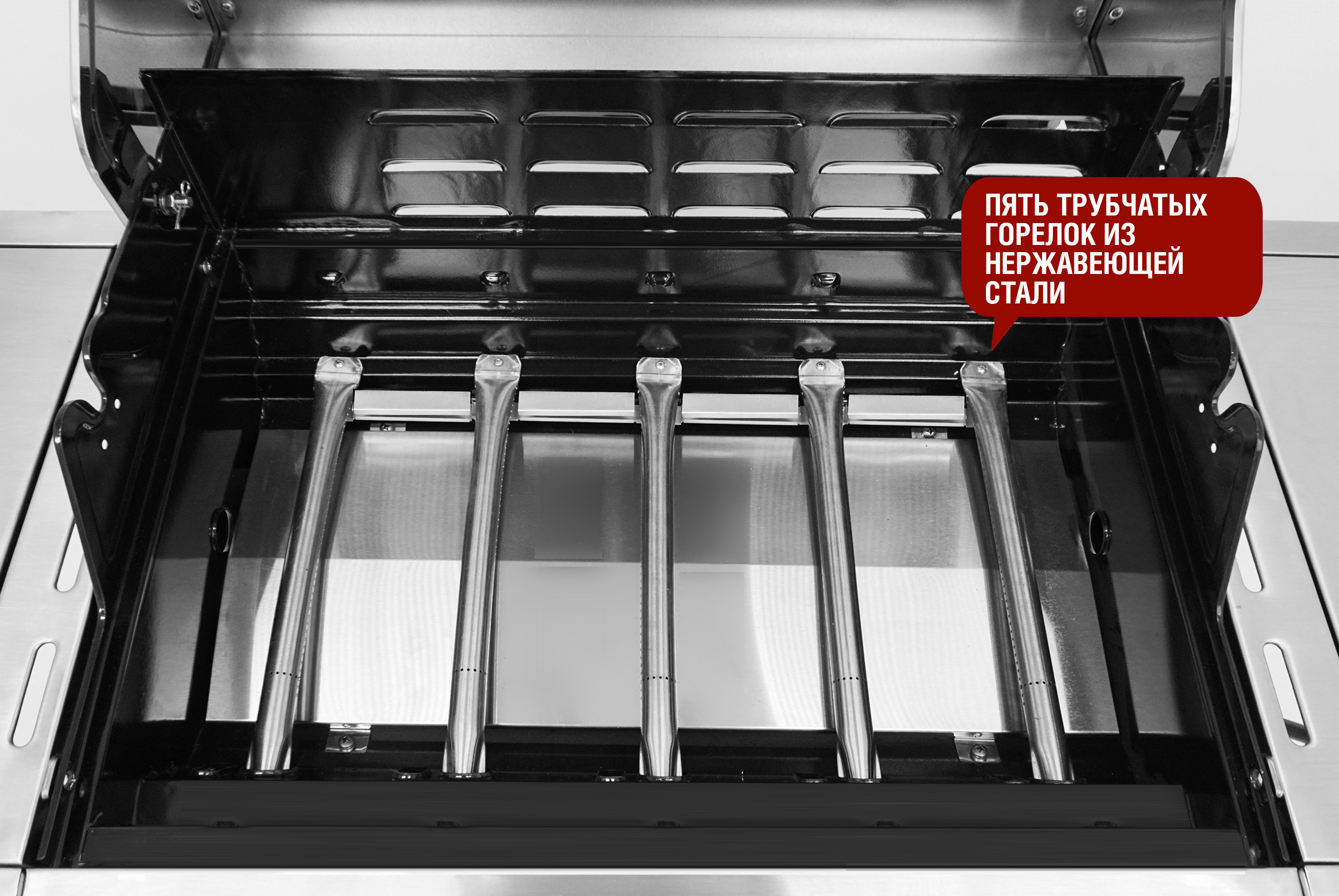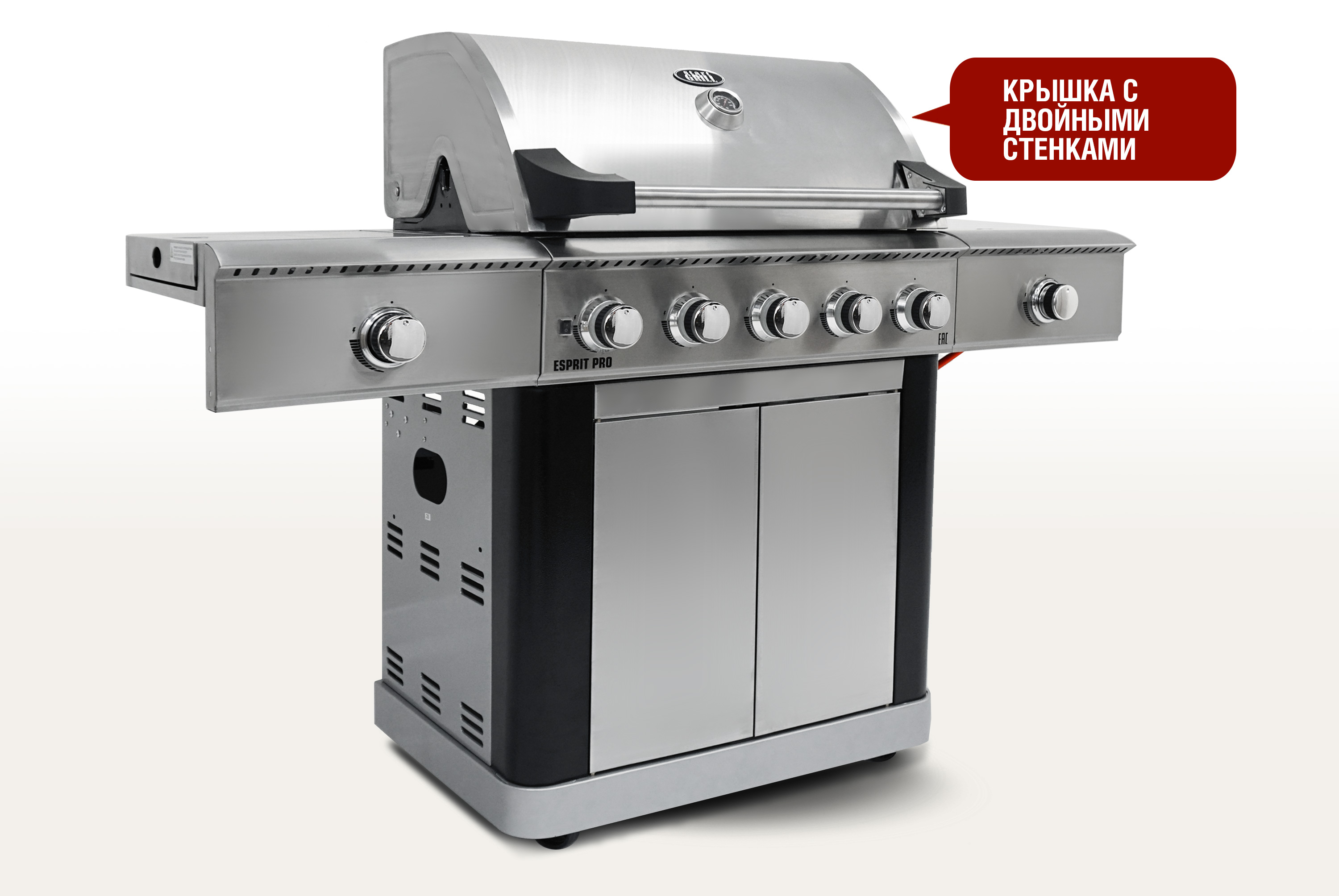 Ярким преимуществом модели Esprit Pro является наличие 5 горелок, которые обеспечивают равномерное распределение тепла. Инфракрасная ветроустойчивая левая боковая горелка разогревается до 800°C и гарантирует идеальную прожарку мяса в любую погоду. Правая мощная боковая горелка прекрасно подойдет для приготовления фирменных соусов. Гриль укомплектован чугунными решетками для приготовления, чугунной планчей и решеткой для подогрева.
