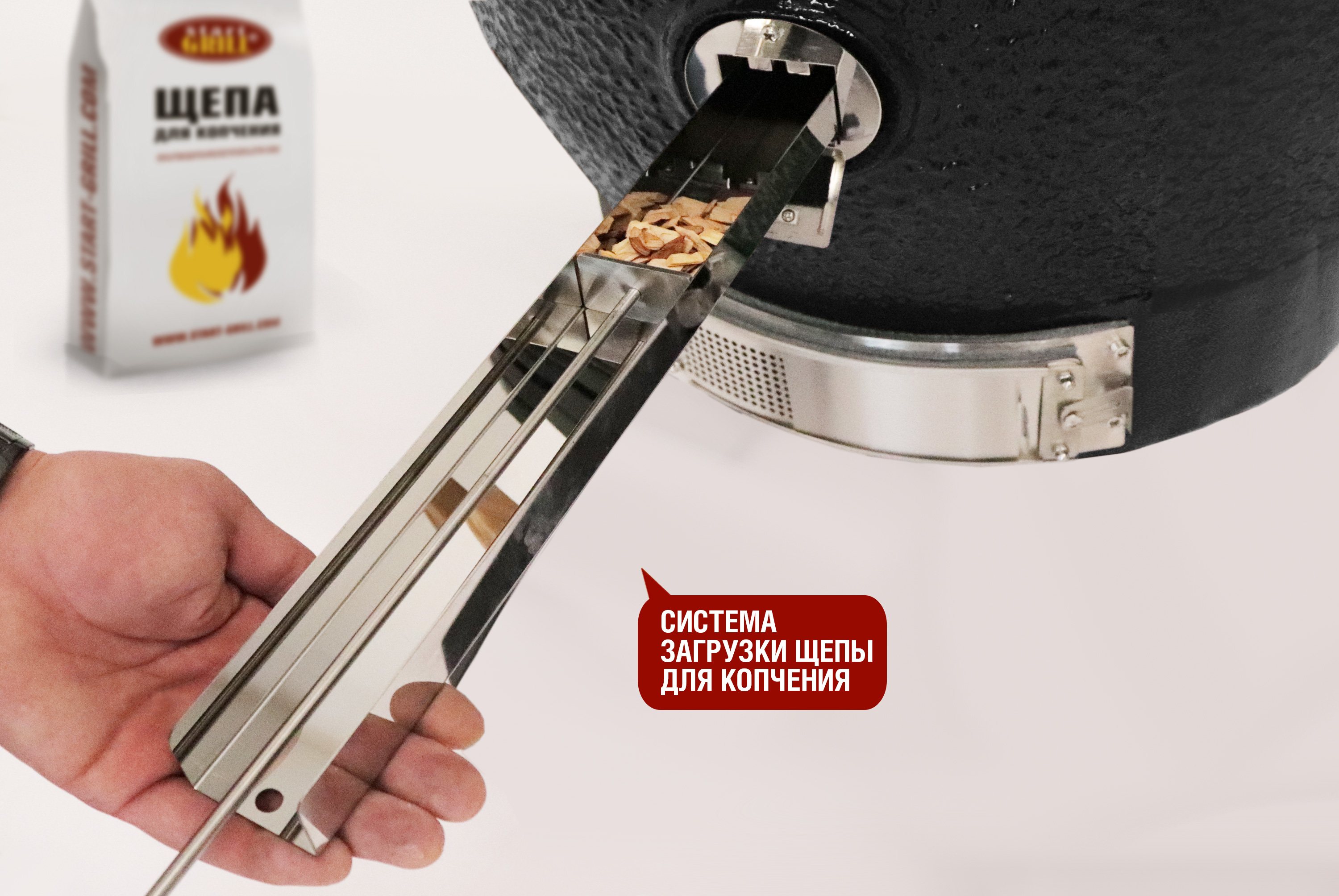 Start Grill SG 24 CFG CHEF PRO имеет в своем арсенале удобную и эффективную систему подачи щепы CFG. Эта система представляет собой открывающийся отсек в корпусе гриля, направляющий лоток и толкатель. Теперь нет необходимости убирать продукты с решетки для приготовления, снимать саму решетку, чтобы загрузить дополнительную порцию щепы. Система CFG позволяет добавить щепу за считанные секунды, не открывая крышки гриля.