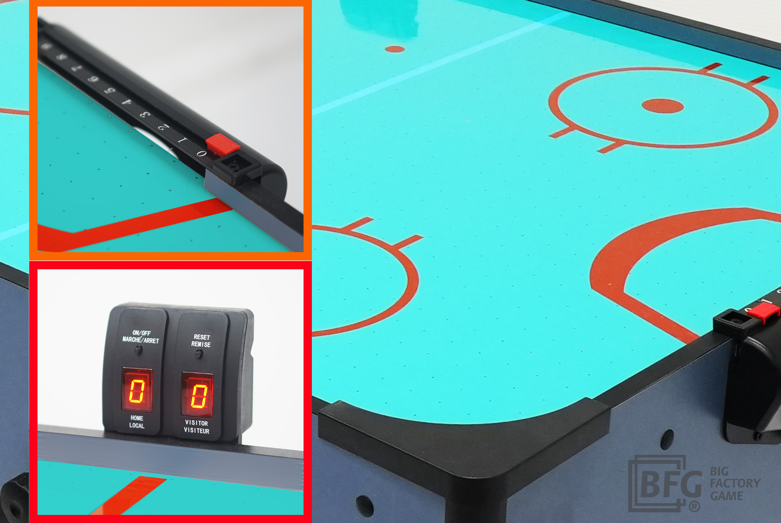 Каждый аэрохоккей стол оборудован удобным и информативным электронным счетчиком очков. Кроме того подсчет результатов матча может быть осуществлен с помощью механических счет, встроенных в ворота.