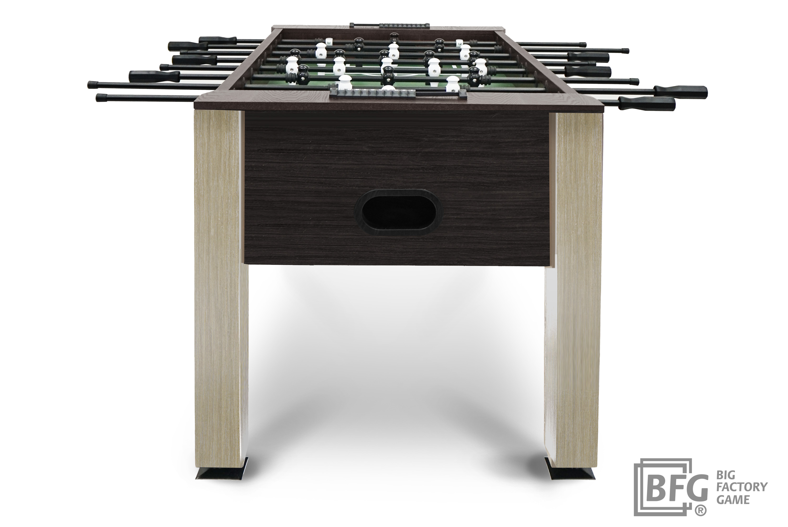 Стол оборудован профессиональными штангами и стилизованными фигурками игроков, выполненными из долговечных и прочных материалов. Ключевым преимуществом модели является материал - стол изготовлен из натурального массива древесины с применением шпона ценных пород.