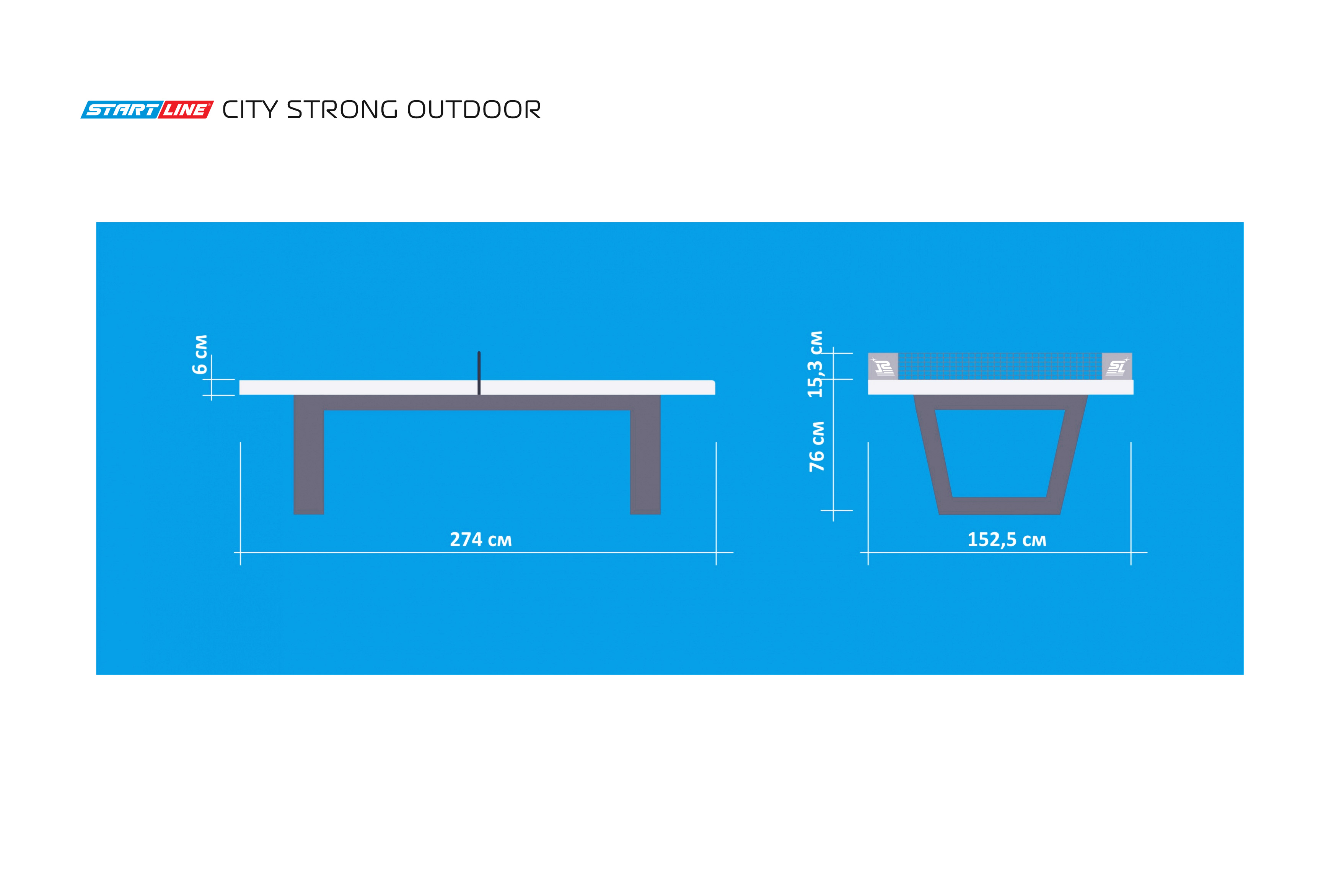 Основание стола City Strong Outdoor выполнено с применением армированного бетона, что обеспечивает его стойкость перед неблагоприятными воздействиями. Из-за своего внушительного веса - 890 кг, стол не требует дополнительного крепления к поверхности, к столу прилагается подробная инструкция по сборке. Столешница теннисного стола City Strong Outdoor изготовлена из супер прочного камня Super Stone, покрытого специальной пропиткой. Камень стойко выдерживает любые погодные условия и перепады температуры, не деформируется от сильных ударов, а наоборот делает их более точными. Также стол City Strong Outdoor оснащен встроенной металлической перфорированной сеткой толщиной 3 миллиметра, что защищает стол от актов вандализма.