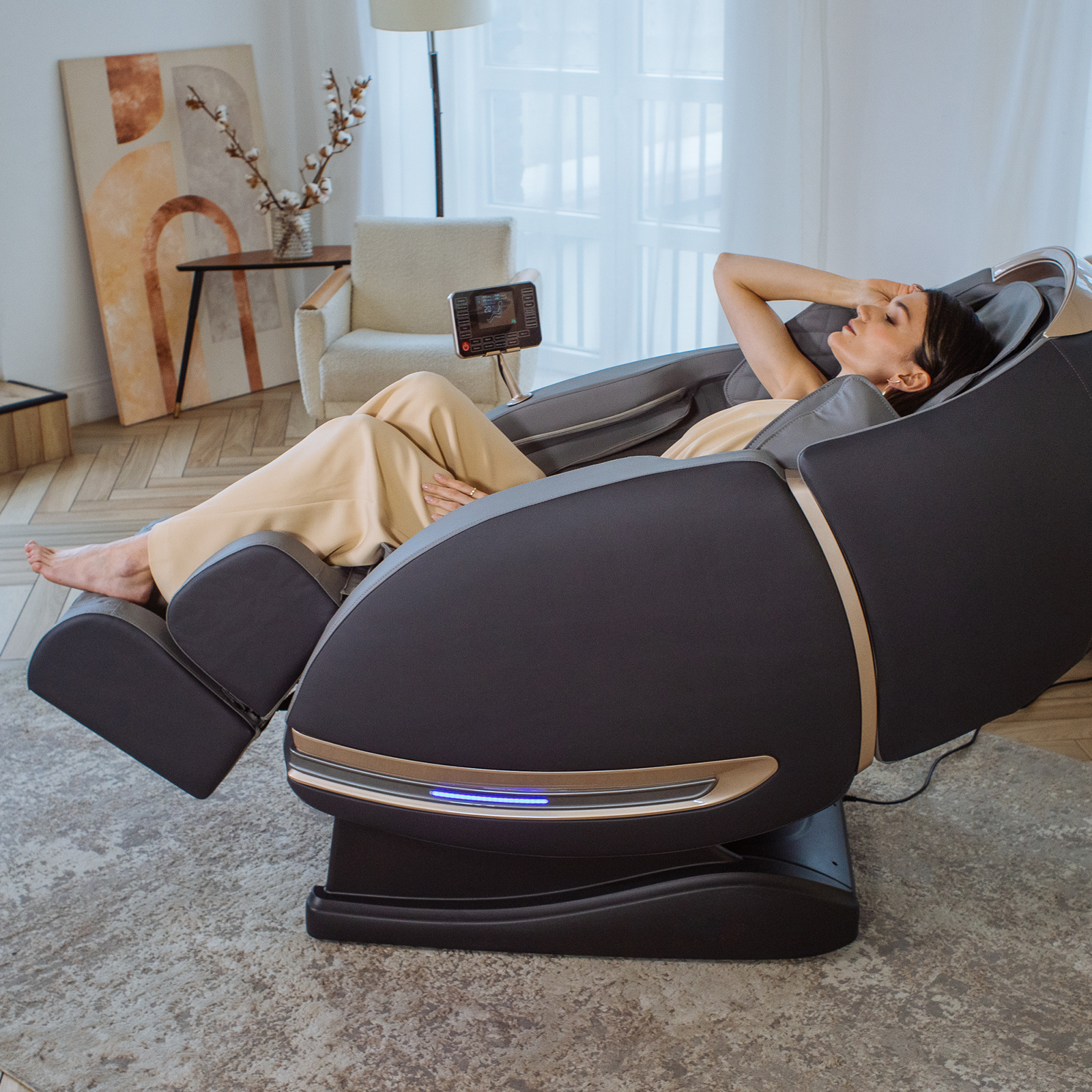 Одновременный прогрев поясницы и икр, положение Zero-G для большего расслабления.