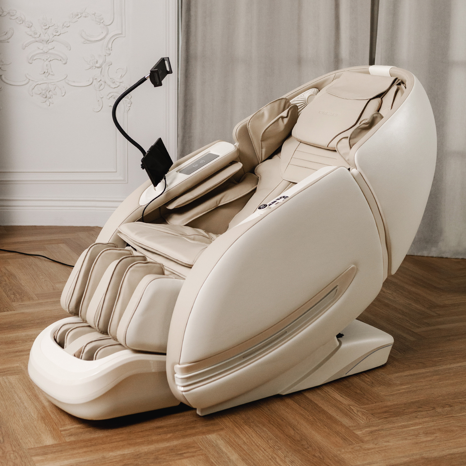 Функция Zero-G с двумя положениями невесомости оптимально распределяет вес тела и усиливает эффект массажа. Система Smart-Slide позволяет размещать кресло всего в 18 сантиметрах от стены. Встроенный биосенсор анализирует показатели организма и корректирует параметры работы. Управление осуществляется через интуитивно понятный планшет и кнопки быстрого доступа. Для комфортного использования смартфона во время сеанса предусмотрена специальная кнопка пролистывания ленты социальных сетей в области пальцев. В подлокотник встроена беспроводная зарядка для смартфона и подвижная подставка для гаджетов. Встроенные Bluetooth-колонки позволяют наслаждаться любимой музыкой во время сеанса массажа.