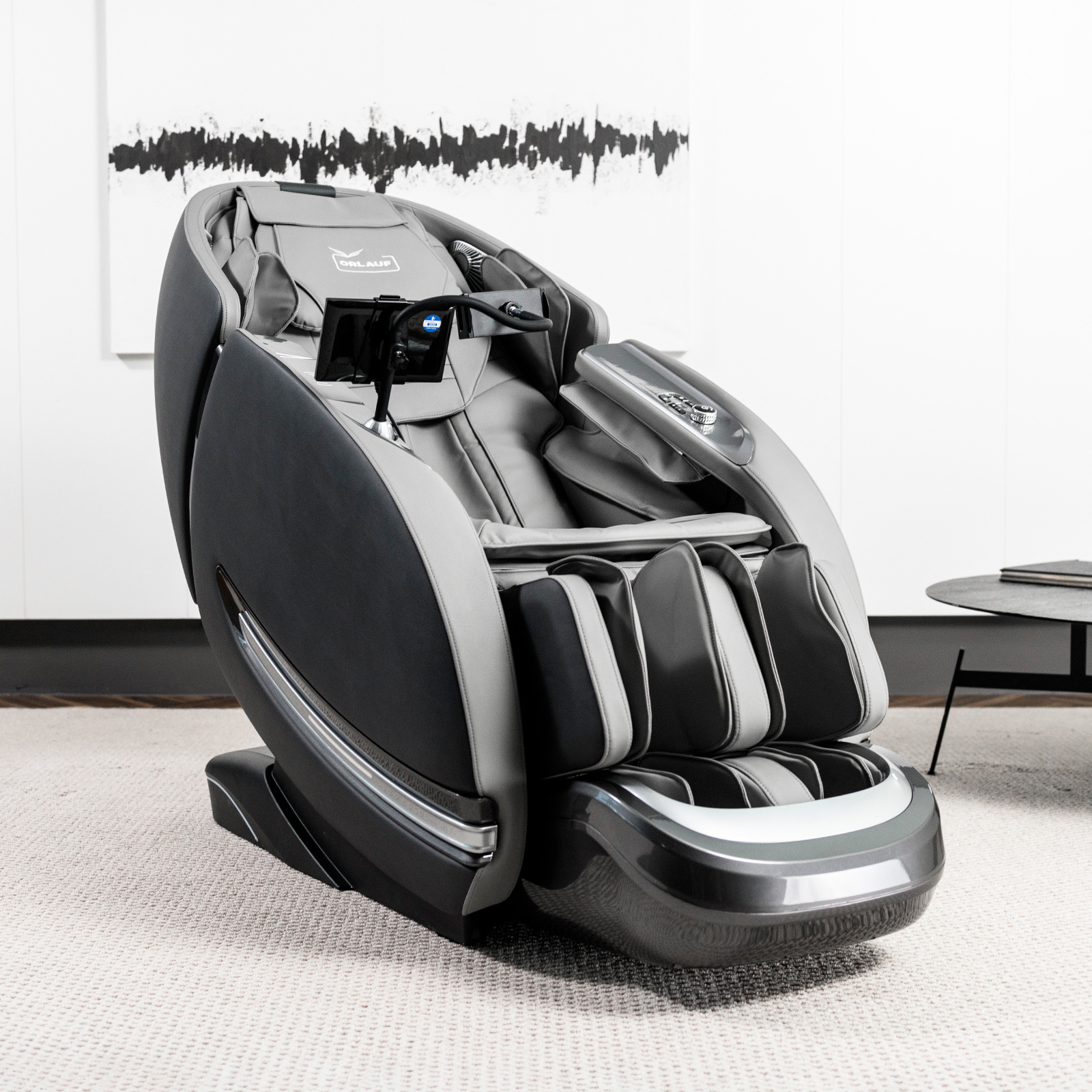 Управление осуществляется через интуитивно понятный планшет и кнопки быстрого доступа. Для комфортного использования смартфона во время сеанса предусмотрена специальная кнопка для пролистывания лент соцсетей EasySlide™, расположенная в зоне для пальцев. В подлокотник встроены беспроводная зарядка для смартфона и подвижная подставка для гаджетов. Встроенные Bluetooth-колонки позволяют наслаждаться любимой музыкой во время сеанса массажа.