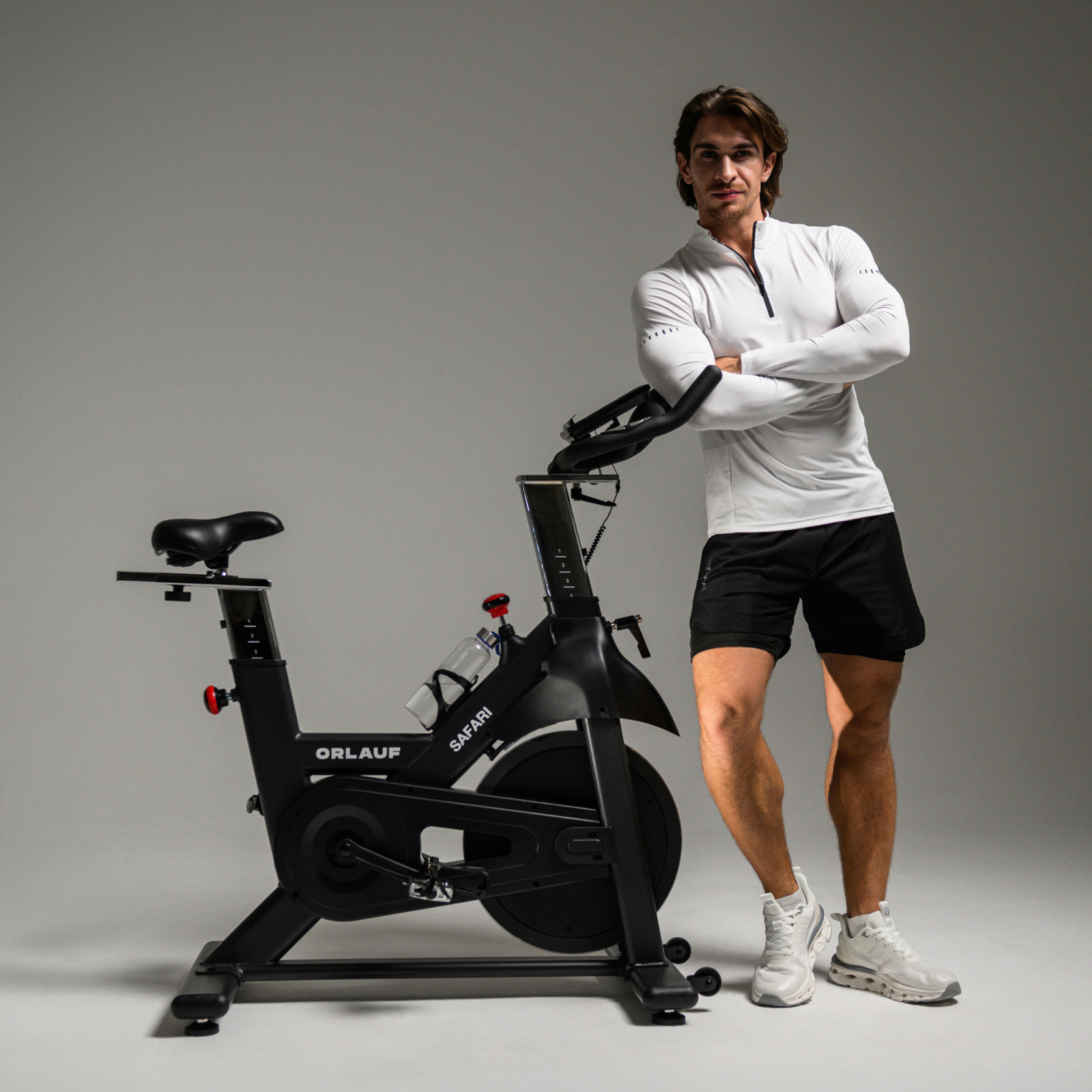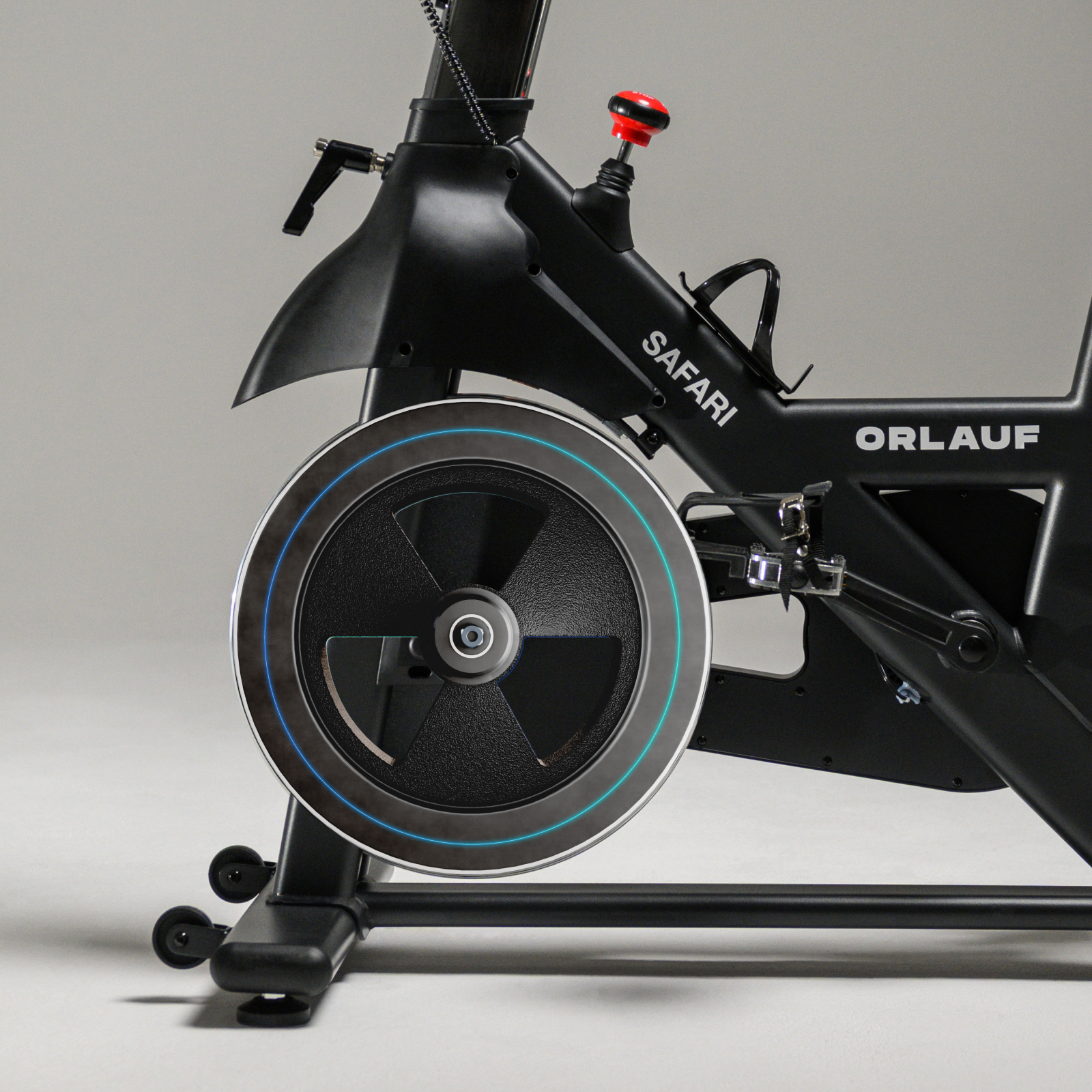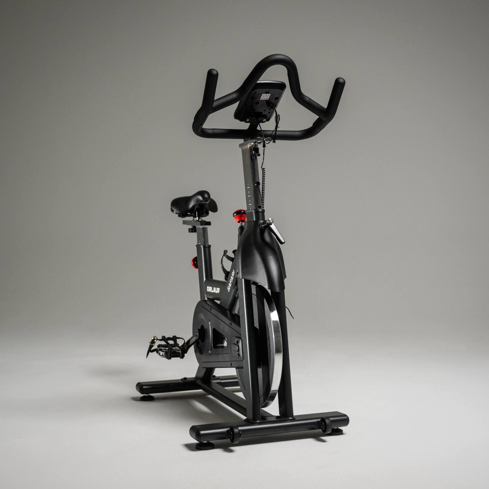 Orlauf Safari — коммерческий спин-байк для фитнес-клубов и домашнего использования. Ключевое преимущество — полная автономность: тренажер работает без электросети, что обеспечивает свободу размещения. Конструкция рассчитана на пользователей весом до 160 кг и вертикальную посадку для правильной биомеханики.