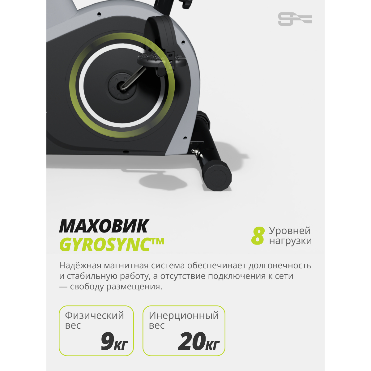 Маховик GyroSync™ с физическим весом 9 кг и инерционным 20 кг воспроизводит естественные ощущения от езды на настоящем велосипеде. Магнитная система нагружения с 8 уровнями сопротивления позволяет точно регулировать интенсивность тренировок — от спокойного занятия до интервальных нагрузок. Прочная конструкция рамы гарантирует устойчивость и выдерживает пользователей весом до 120 кг.