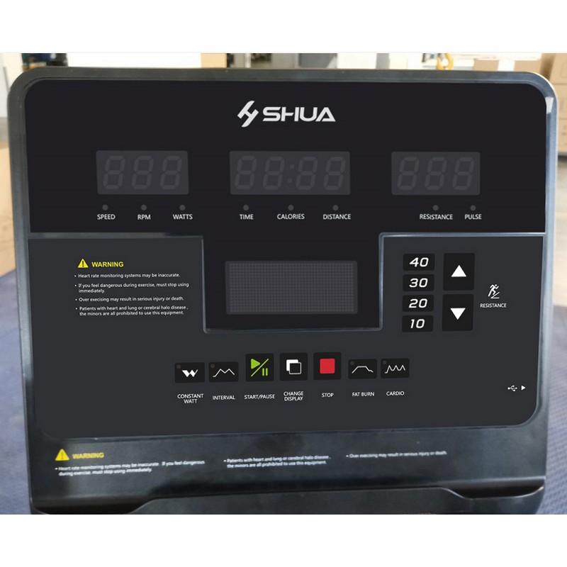Конструкция велотренажера: вертикальный.Класс тренажера по применению: SЯзык интерфейса: английский.Питание от сети: не требуется, автономное.Передаточное число: 1:9,7.Диаметр ремня: 290 мм.Мощность: 250 Вт при 60 Об/мин.Консоль: матричный LED-дисплей размером 15,6 дюймов (40 см, 16х40 сегментов) и 3 вспомогательных LED дисплея (2 - 3х8 сегментов, 1 - 4х8 сегмента) с белой подсветкой.Параметры отображаемые на дисплее: время, дистанция, калории, количество оборотов в минуту, скорость.Кнопки быстрого доступа на консоли: интервальная, кардио, сжигание жира Fat Burn, режим постоянной мощности, изменение сопротивления 10, 20, 30, 40.Вес маховика: 14 кг (инерционный вес 29,3 кг).Система нагружения:...- Бренд SHUA